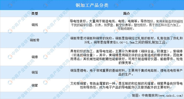 铜是重要的工业金属,也是全球能源转型背景下重要的新能源金属,因具有良好的导电性、导热性和可塑性,被广泛运用于包括电气和电子工业、建筑工业、机械制造、航空航天、汽车制造、工业设备制造等领域。铜加工是铜产业链当中的重要一环,目前铜加工产品主要分为铜线、铜板带、铜棒、铜箔、铜管五大类,具体情况如下: