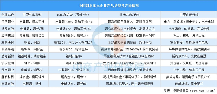 中国铜材行业发展态势良好,其中江西铜业主要产品为电解铜和铜加工材,2024年铜加工材产能 180 万吨。企业掌握铜冶炼绿色化技术、高精度铜箔技术,产品应用于电力、新能源(锂电池)、电子电路等领域。以下为部分重点企业的产品类型及产能情况: