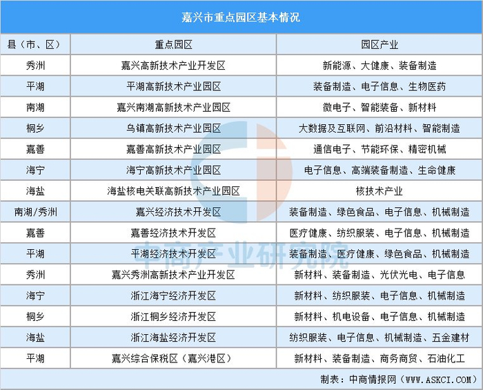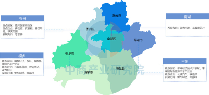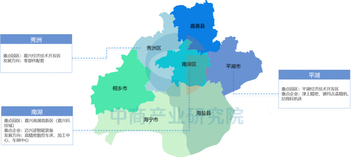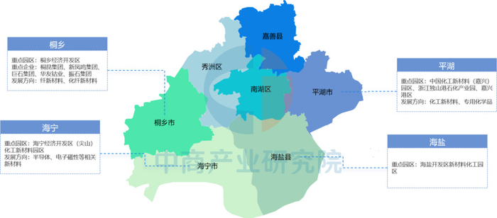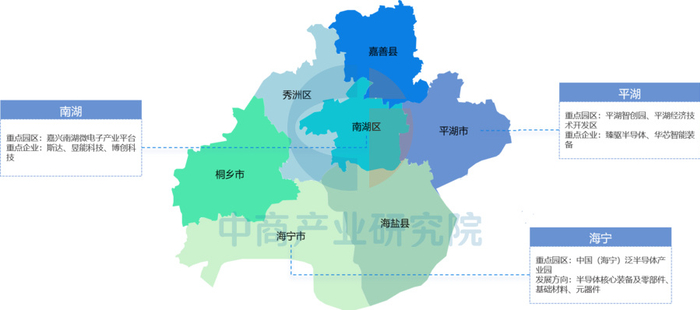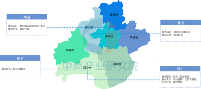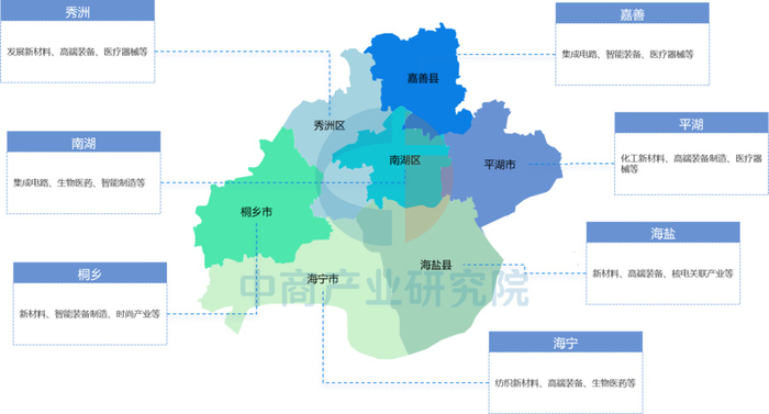 嘉兴市辖南湖、秀洲两个区,嘉善、海盐两个县,以及平湖、海宁、桐乡三个县级市,各区域主导产业分布如下: