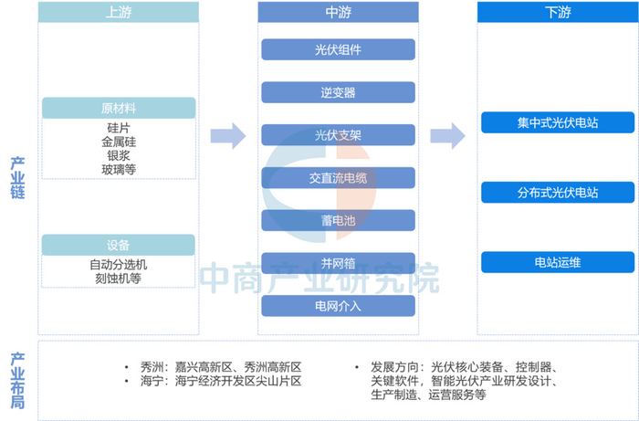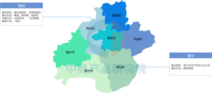 嘉兴市智能光伏产业重点发展光伏核心装备、控制器、关键软件,智能光伏产业研发设计、生产制造、运营服务等,主要集中于秀洲与海宁。
