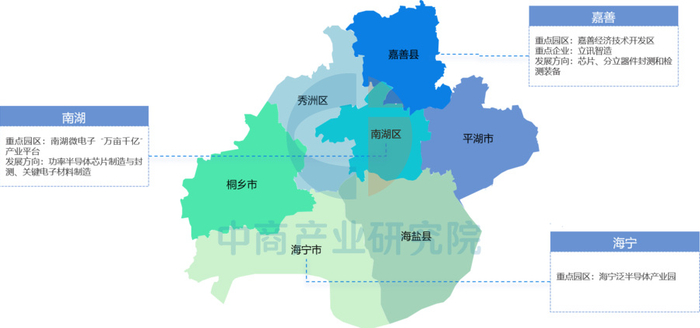 嘉兴市集成电路产业着重发展功率半导体芯片、光通讯芯片、射频芯片等关键品类,聚焦大功率绝缘栅双极型晶体管(IGBT)研发,推进智能芯片制造与封测,强化关键电子材料攻关,产业布局于南湖、海宁、平湖。