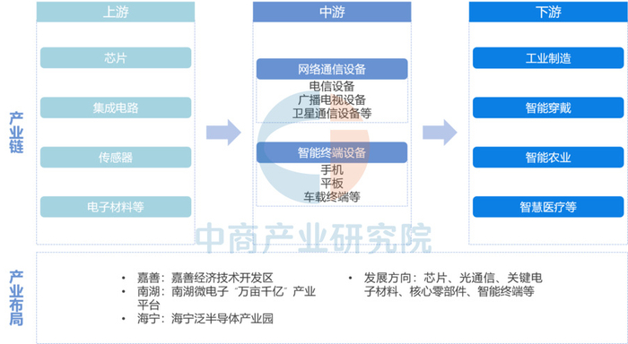 嘉兴市智能物联产业聚焦关键领域,积极推动芯片、光通信、关键电子材料、核心零部件、智能终端等产业领域创新发展,重点落位于南湖、海宁、嘉善。