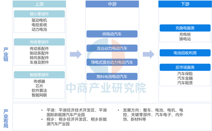 嘉兴市新能源汽车产业聚焦整车制造、电池、电机、电控等核心领域,大力发展关键零部件、汽车电子等配套产业,积极推动新材料研发应用。产业主要布局于秀洲、南湖、桐乡、平湖,协同打造完备产业生态。