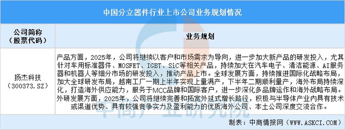 2025年扬杰科技将围绕客户和市场需求,在产品研发、全球发展和外延发展方面推进业务规划,加强在分立器件领域的布局和竞争力。