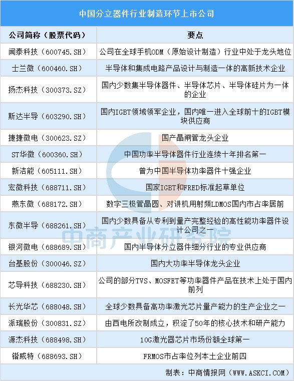 代表性企业有闻泰科技、士兰微、扬杰科技等。