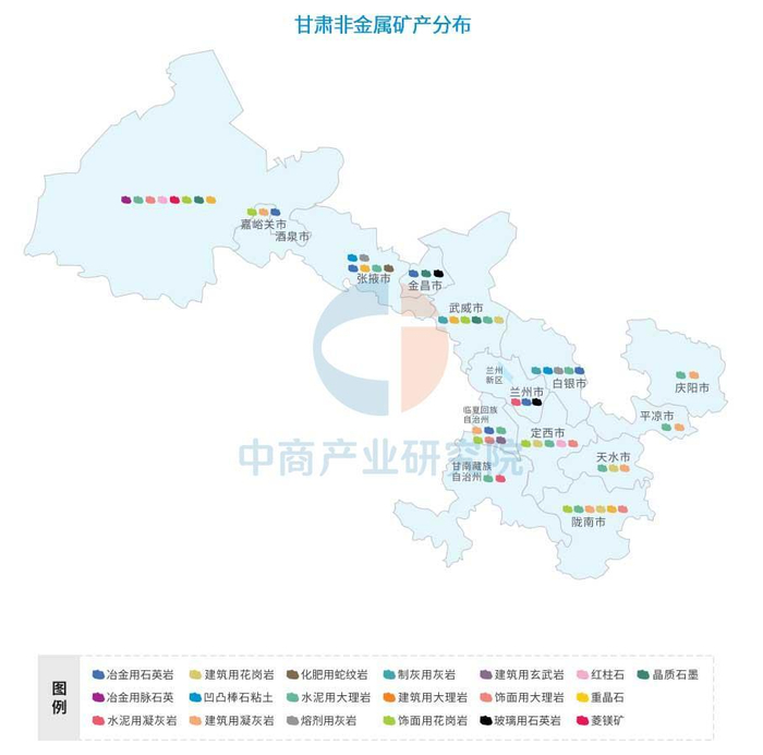 甘肃省非金属矿产资源分布中,冶金用脉石英、红柱石、菱镁矿主要集中分布在酒泉市,化肥用蛇纹岩集中在张掖市,玻璃用石英岩主要分布在兰州市,重晶石主要集中在陇南市。水泥用大理岩、建筑用花岗岩、饰面用花岗岩等非金属矿产分布较为广泛,在甘肃省大部分市(州)均有分布。