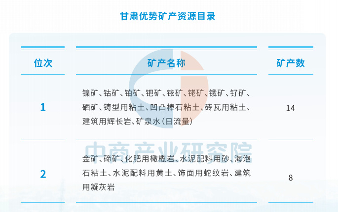 中商情报网讯:甘肃省是全国矿产资源较为丰富的省份之一,省内地层发育较齐全,地质构造复杂,岩浆活动强烈,多期次的构造运动形成了北山、阿尔金山、龙首山、祁连山和西秦岭等重要造山成矿带,赋存有金、铜、镍、铅、锌、钨、钒、“三稀”和晶质石墨等重要矿产资源。