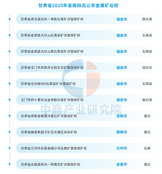 甘肃梳理汇总符合出让条件的矿业权,全面落实矿产资源有偿使用制度,2025年省级拟出让非金属矿业权共10个,保障矿业经济良性发展。项目包括石英岩矿、萤石、脉石英矿等,酒泉出让数量最多,金昌、兰州、陇南、张掖也均有分布。