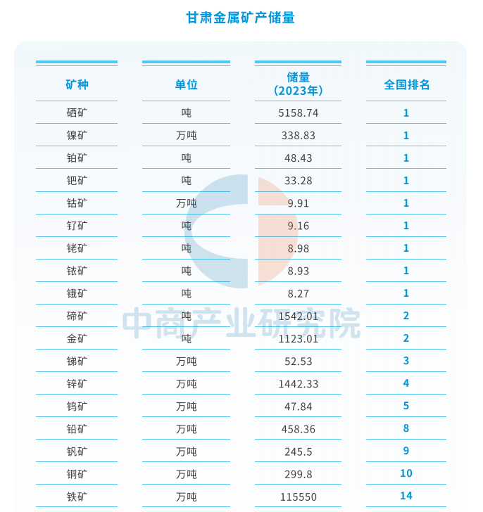 甘肃矿产资源相对丰富,矿产种类比较齐全,甘肃已发现各类金属矿产36种。甘肃多种金属储量位居全国前列,镍矿、钴矿、铂矿、钯矿、铱矿、铑矿、锇矿、钌矿、硒矿等金属矿产储量排名全国第一,锑矿、锌矿、钨矿、金矿、碲矿等金属矿产储量居全国前五。