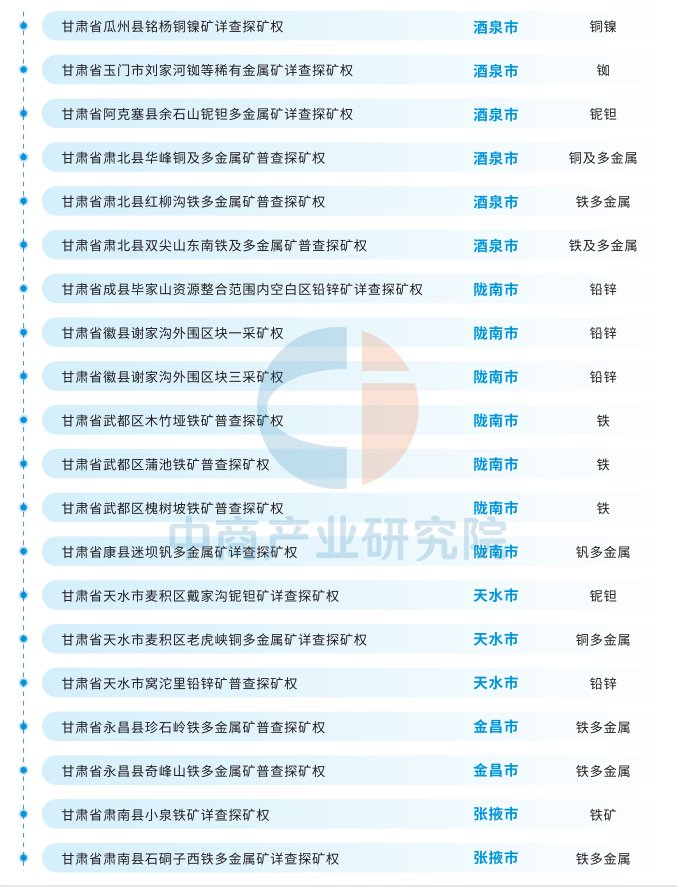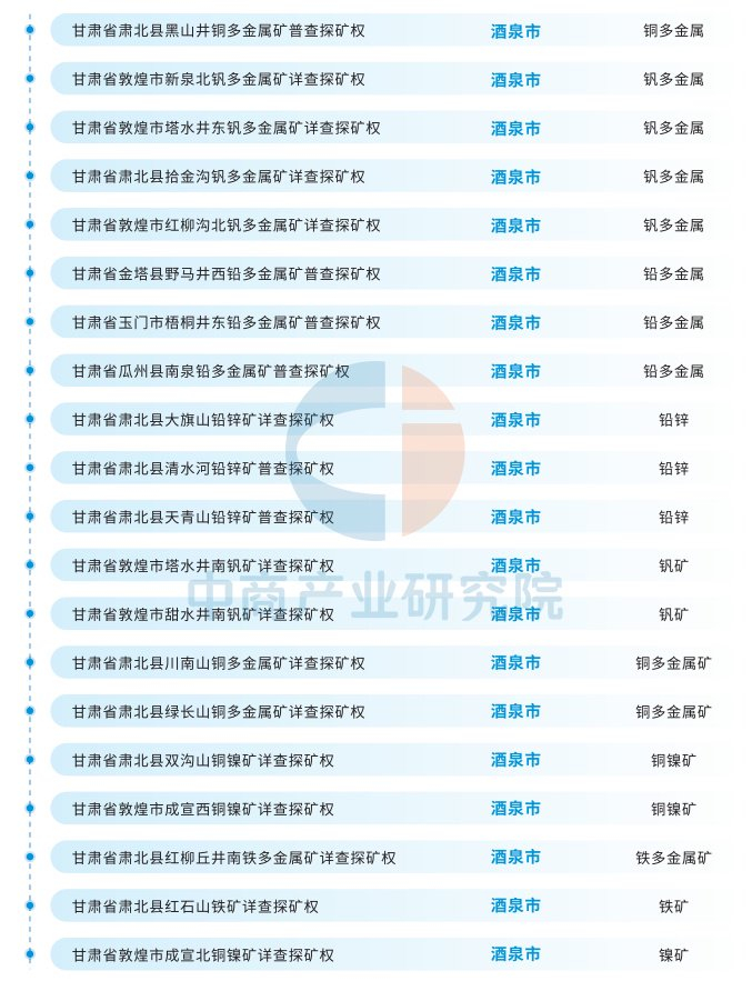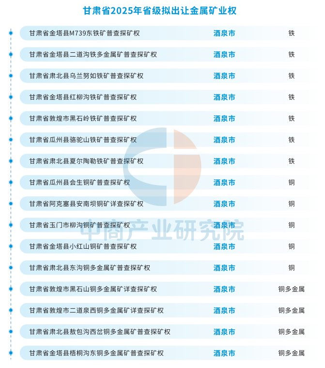 甘肃全面推进矿业权竞争性出让,促进矿产资源配置合理高效。2025年省级拟出让金属矿业权共56个,项目重点围绕铁、铅、锌、铜等金属矿产,主要分布在酒泉、陇南。