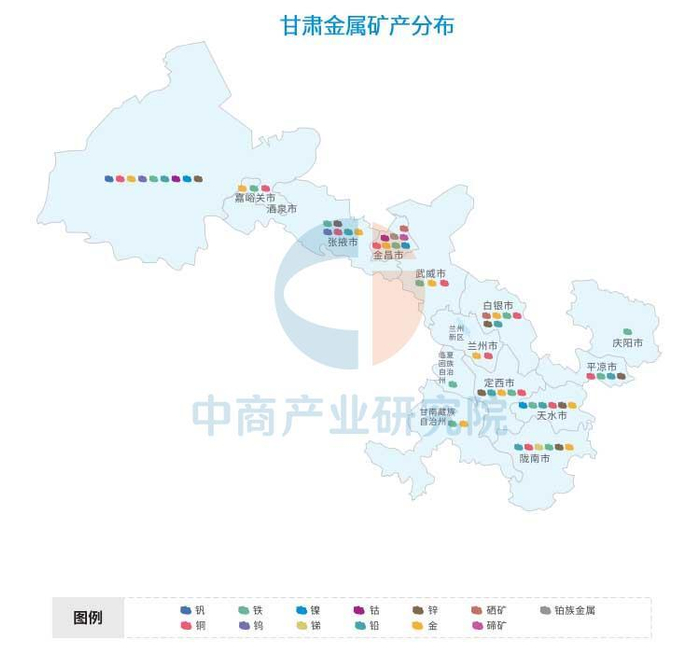 甘肃省金属矿产资源分布高度集中,93%的铁矿石集中于张掖、酒泉、甘南地区;99%的镍、全部的铂族和74%的铜、92%的钴集中于金昌地区;97%的铅锌、88%的锑集中于陇南地区;99%的钨集中于张掖、酒泉地区;75%的金集中于陇南、甘南地区。