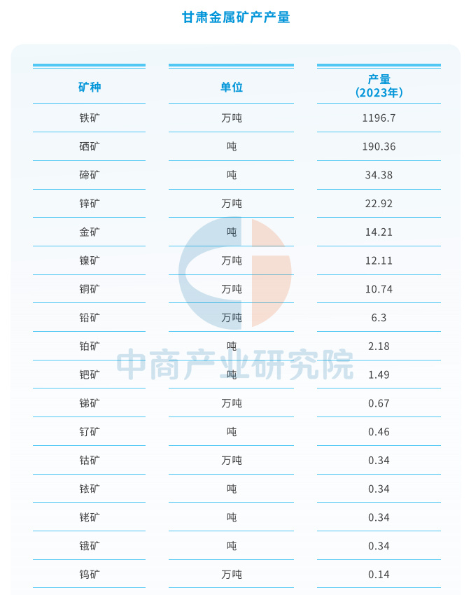 甘肃金属矿产产量较高。2023年铁矿产量1196.7万吨,锌矿、镍矿、铜矿产量超10万吨。硒矿产量超190吨,碲矿、金矿产量超10吨。