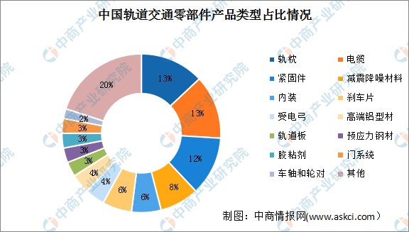 轨道交通装备机械零部件是铁路及城市轨道交通系统的关键组成部分。轨道交通零部件中占比最大的为轨枕和电缆,均占13%。电缆是用于传输电能或信号的装置,而轨枕则是铁路配件的一种,用于支撑轨道并吸收列车通过时产生的压力。其次,紧固件占比为12%。