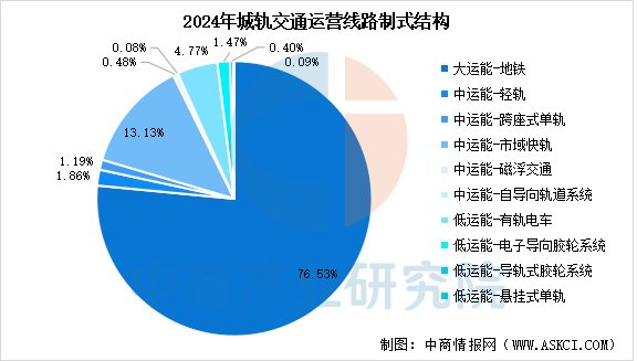 截至2024年底,城轨交通运营线路包含10种制式。其中,地铁9306.09公里,占比76.53%;轻轨225.85公里,占比1.86%;跨座式单轨144.65公里,占比1.19%;市域快轨1597.25公里,占比13.13%;磁浮交通57.86公里,占比0.48%;自导向轨道系统10.19公里,占比0.08%;有轨电车 579.94公里,占比4.77%;电子导向胶轮系统179.09公里,占比1.47%;导轨式胶轮系统49.36公里,占比0.40%;悬挂式单轨10.50公里,占比0.09%。