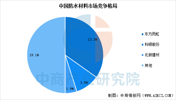 目前,我国建筑防水材料行业呈现“一超多强”的竞争格局,市场集中度较低,其中:“一超”为行业龙头企业——东方雨虹,其品牌影响力强,同时拥有全国防水卷材最多生产线,目前基本完成了全国性布局;“多强”为行业领跑企业,如科顺股份、北新建材、凯伦股份、三棵树、卓宝科技、宏源防水和雨中情等。