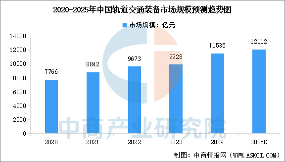 受国家产业政策的大力扶持,我国高速铁路、城市轨道交通等基础设施建设持续展开,动车组、城市轨道车辆等轨道交通装备市场规模不断扩大。中商产业研究院发布的《2025-2030年中国轨道交通装备行业市场前景预测及未来发展趋势研究报告》显示,我国轨道交通装备行业市场规模由2020年的7766亿元增长到2024年的11535亿元,年均复合增长率达10.4%。中商产业研究院分析师预测,2025年中国轨道交通装备行业市场规模将达12112亿元。