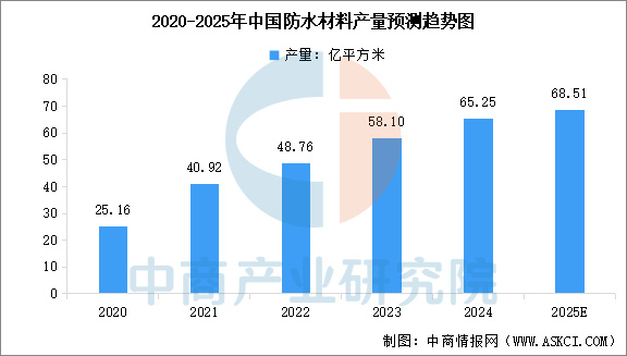 随着社会经济和城市化建设的飞速发展,建筑业的迅速崛起,对防水材料的要求也进一步提升,带动了防水材料工业迅速发展。近年来,我国新的防水材料产品不断问世,防水材料的产量呈快速增长态势。中商产业研究院发布的《2025-2030年中国防水材料行业发展前景及投资风险预测报告》显示,2023年我国防水材料产量为58.10亿平方米,同比增长19.2%,2024年产量约为65.25亿平方米。中商产业研究院分析师预测,2025年中国防水材料产量将增至68.51亿平方米。