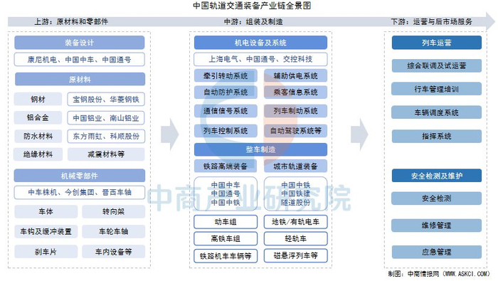 轨道交通装备产业链上游为装备设计、原材料以及核心零部件供应,主要包括钢材、铝材、防水材料、绝缘材料、车体、车轮车轴、转向架等;中游是轨道交通装备的核心制造环节,包括机电设备及系统、整车制造,机电设备及系统包括牵引传动系统、辅助供电系统、列车制动系统、列车控制系统、通信信号系统等,整车制造涵盖了铁路高端装备和城市轨道装备两大板块;下游环节涉及轨道交通装备的运营、安全检测及维护。