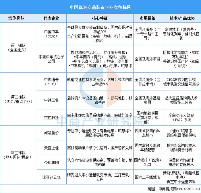 中国轨道交通装备行业竞争梯队呈现“一超多强、分层竞争”的产业格局,市场集中度高。第一梯队以中国中车为核心,年收入超1000亿元,国内市场占有率超60%,掌握高铁、地铁整车及核心系统全产业链能力,凭借技术专利、规模化生产和“一带一路”海外拓展形成垄断优势。其子公司如中车四方、中车长客在动车组、城轨车辆等细分市场占据主导地位。