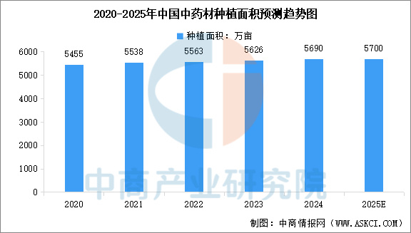 中药材是中医药的源头,当前我国中药材的供应能力持续提高,生产布局进一步优化,全国已经形成了东北、华中、西南等七大道地药材产区。中商产业研究院发布的《2025-2030年中国中医药市场需求预测及发展趋势前瞻报告》显示,全国中药材种植面积保持在五千万亩左右,2024年中国中药材种植面积约5690万亩。中商产业研究院分析师预测,2025年中国中药材种植面积将达到5700万亩。