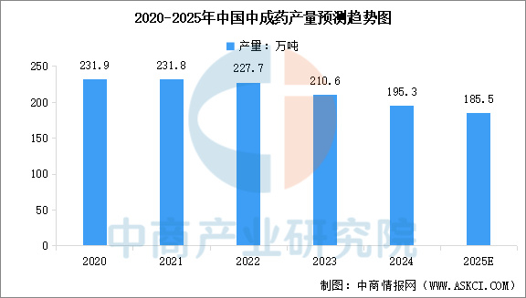 近年来,在医保控费、重点监控辅助用药、限输令、新药审批从严等政策影响下,我国中成药的产量整体呈下降趋势。中商产业研究院发布的《2025-2030年中国中医药市场需求预测及发展趋势前瞻报告》显示,2024年中国中成药产量为195.3万吨,较上年减少7.26%。中商产业研究院分析师预测,2025年中国中成药产量将降至185.5万吨左右。
