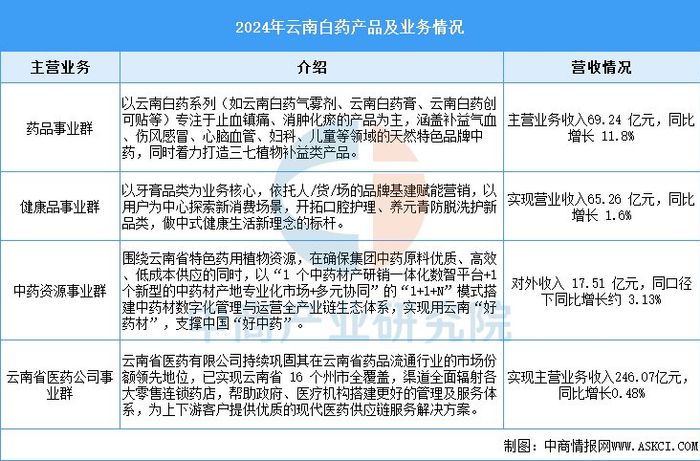 云南白药以药品、健康品、中药资源、云南省医药公司四大事业群为生产经营核心底座,2024年中药资源事业群实现对外收入17.51亿元,同口径下同比增长约3.13%。