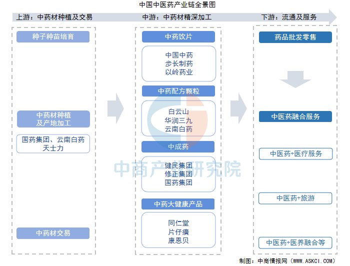 中医药产业链上游为中药材种植及交易;中游为中药材精深加工,主要分为中药饮片、中药配方颗粒、中成药、中药大健康产品等;下游为药品流通及服务。