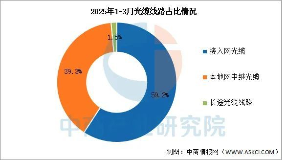 中商产业研究院发布的《2025-2030年中国光纤光缆市场深度分析及发展趋势预测报告》显示,接入网光缆、本地网中继光缆和长途光缆线路所占比重分别为59.2%、39.3%和1.5%。