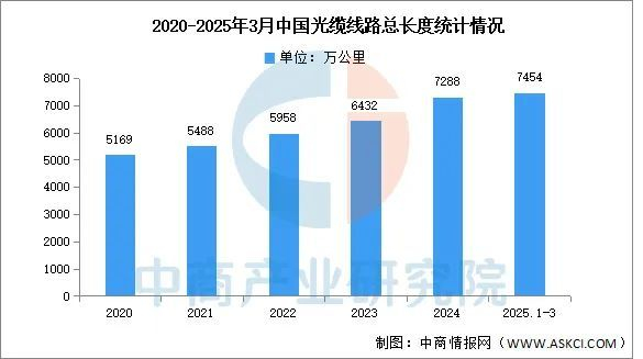 中商产业研究院发布的《2025-2030年中国光纤光缆市场深度分析及发展趋势预测报告》显示,光缆线路总长度稳步增加,截至2025年3月末,全国光缆线路总长度达到7454万公里,同比增长13.7%。