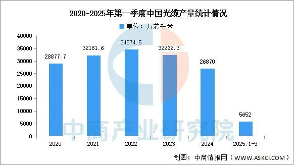 近年来,我国光缆产量呈现稳定上升的趋势。中商产业研究院发布的《2025-2030年中国光纤光缆产业需求预测及发展趋势前瞻报告》显示,2024年中国光缆产量达26870万芯千米,同比下降18.2%。2024年第一季度光缆产量达5652万芯千米,同比下降5.4%。