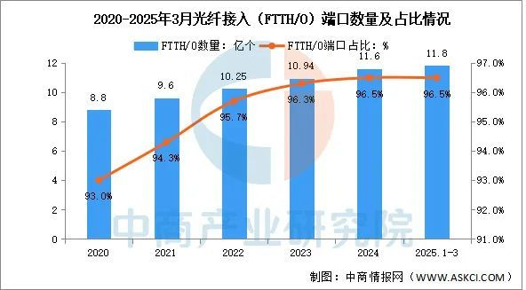 中商产业研究院发布的《2025-2030年中国光纤光缆产业需求预测及发展趋势前瞻报告》显示,千兆光纤宽带网络建设稳步推进,截至2025年3月末,光纤接入(FTTH/O)端口达到11.8亿个,比上年末净增2085万个,占互联网宽带接入端口的96.5%。