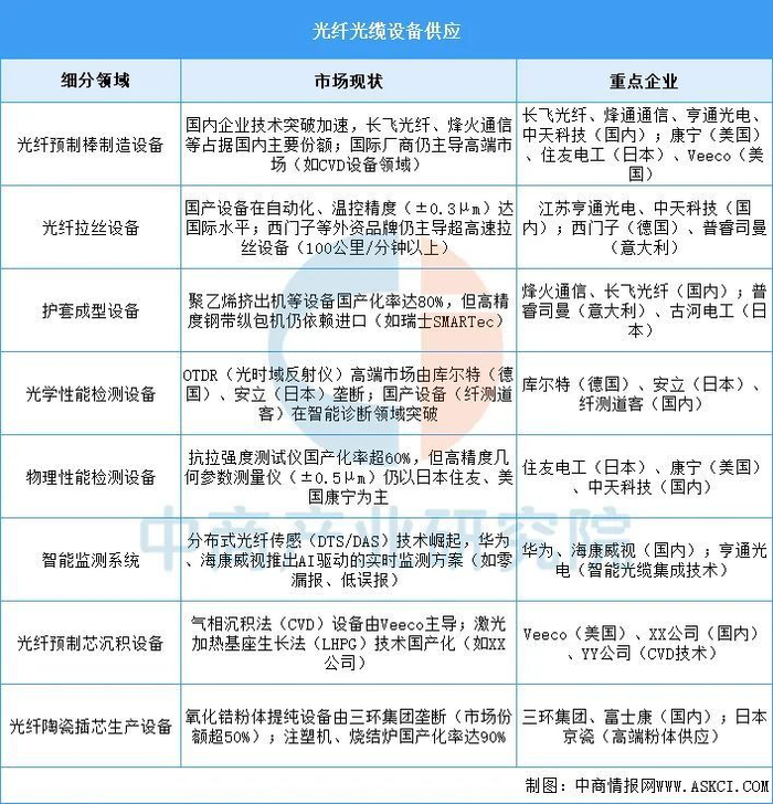 光纤光缆上游生产设备主要包括光纤预制棒制备设备、光纤拉丝设备以及护套成型设备,其中CVD设备和高速拉丝设备的国产化率逐步提升但高端市场仍由Veeco、西门子等国际企业主导。检测设备涵盖光学性能测试、物理性能测试以及智能监测系统,高端OTDR和光谱分析仪仍依赖库尔特、安立等进口品牌,但华为、纤测道客等国内企业在智能诊断领域取得突破。重点企业包括国内的长飞光纤、亨通光电、烽火通信、中天科技,以及国际的康宁、住友电工、Veeco等。