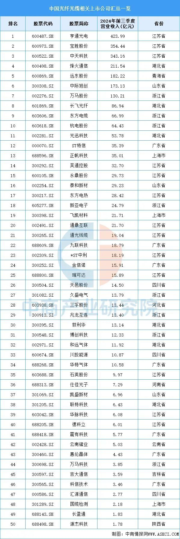 目前,中国光纤光缆相关A股上市企业主要分布在江苏省,共13家。浙江省共有8家,排名第二。广东省和河北省均为7家,并列第三。