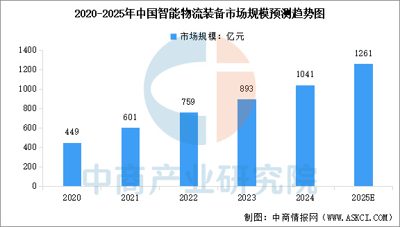 智能物流装备指用于产品运输和储存的自动化装备和系统。中商产业研究院发布的《2025-2030年中国智能物流装备行业研究报告》显示,在供应链自动化需求增长、物联网和人工智能技术进步的推动下,中国智能物流装备的市场规模从2020年的449亿元增至2024年的1041亿元,复合年增长率为23.4%。中商产业研究院分析师预测,2025年中国智能物流装备市场规模将达到1261亿元。