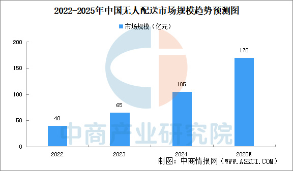 目前,无人配送车、无人机等无人配送设备已经广泛应用于快递、外卖、商超等多个领域。国家对无人配送行业的支持力度持续增强,多项政策规划将无人配送纳入其中,明确了其长期性发展方向。中商产业研究院发布的《2025-2030年中国无人配送深度分析及发展趋势研究预测报告》显示,2022年中国无人配送市场规模约为40亿元,2024年市场规模突破100亿元。中商产业研究院分析师预测,到2025年中国无人配送市场规模将达170亿元。
