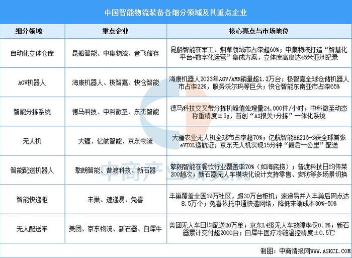 智能物流包括智能包装、智能装卸以及信息的智能获取、智能仓储、智能运输、智能配送、加工和处理等六项基本活动,涉及的智能装备产品包括立体仓库、AVG移动机器人、智能配送机器人、无人机、智能快递柜等,各细分领域重点企业如下图所示: