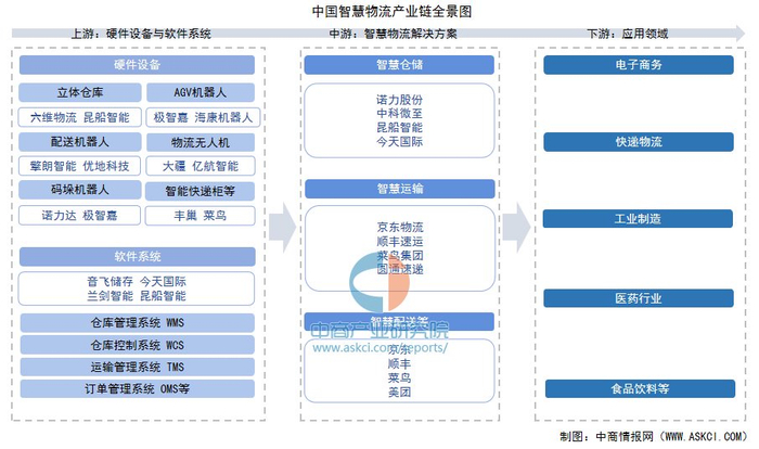 智慧物流产业链上游为硬件设备和软件系统,硬件设备包括立体仓库、AGV机器人、配送机器人、物流无人机、码垛机器人、智能快递柜等,软件系统包括仓库管理系统WMS、仓库控制系统WCS、运输管理系统TMS、订单管理系统OMS等;中游为智慧物流解决方案,包括智慧仓储、智慧运输、智慧配送等;下游应用于工业生产和商业配送等领域。