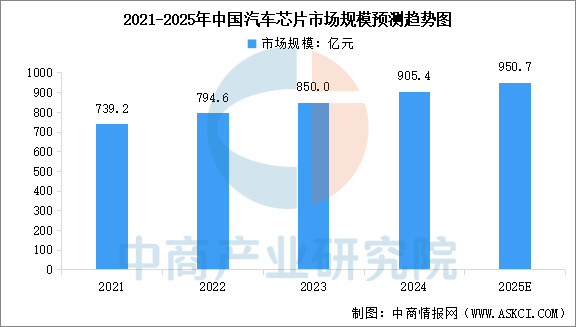 近年来,随着全球汽车产业向电动化、智能化转型步伐日益加快,中国汽车芯片的市场规模不断扩大。中商产业研究院发布的《2025-2030年中国汽车半导体行业市场前景及投资策略研究报告》显示,2024年中国汽车芯片市场规模达905.4亿元,较上年增长6.52%。中商产业研究院分析师预测,2025年中国汽车芯片市场规模有望达950.7亿元。