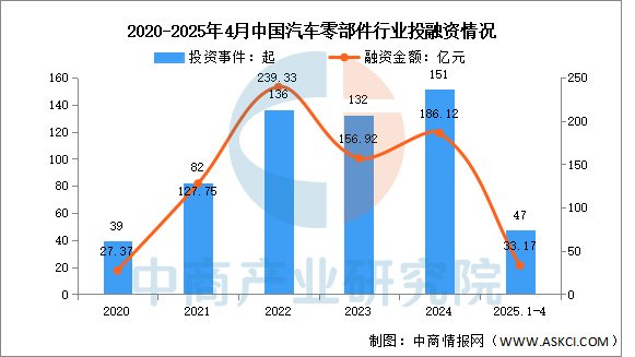 汽车零部件投融资市场是一个复杂而活跃的领域,其动态受到多种因素的影响。近年来,中国汽车零部件市场的投融资活动日益频繁,投资规模不断扩大。2025年1-4月,汽车零部件已披露投资事件共47起,已披露融资金额约33.17亿元。