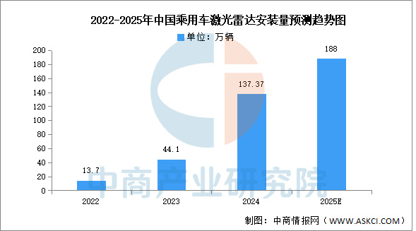 中商产业研究院发布的《2025-2030年中国激光雷达行业市场前景预测及未来发展趋势报告》显示,近年来,受益于中国市场高阶智驾的普及潮,激光雷达前装需求持续攀升。2024年前装标配激光雷达交付新车137.37万辆,同比增长211.78%,前装标配搭载率突破5%,达到5.99%。中商产业研究院分析师预测,2025年乘用车激光雷达安装量将达188万辆。