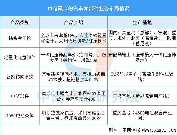 中信戴卡以铝合金车轮为核心业务,依托全球化生产基地和领先的轻量化技术,构建了“车轮-底盘-三电”全链条零部件体系。其技术突破包括一体化压铸工艺、L4级智能转向系统及高导热电驱部件,生产基地覆盖国内核心汽车产业带及海外重点市场。通过绑定国际头部客户,新能源业务占比快速提升,未来将聚焦碳纤维复合材料和车路协同技术,强化在智能电动领域的垂直整合能力。