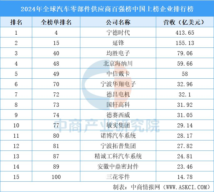 近期,《美国汽车新闻》重磅发布了2024年全球汽车零部件供应商百强榜。中国企业一共上榜15家,其中全榜单前50名中有5家。宁德时代营收最高达413.65亿美元,位居榜首。延锋紧随其后,营收155.13亿元。均胜电子排名第三,营收79.06亿元。北京海纳川、中信戴卡、宁波华翔电子、德昌电机、国轩高科、德赛西威、敏实集团进入前十,依次排名第4-10名。
