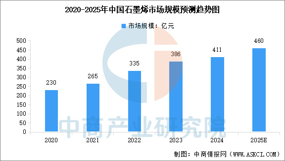 随着石墨烯材料制备及应用技术的不断成熟,叠加下游消费电子、新能源、涂料等产业快速增长,中国石墨烯市场规模不断扩大。中商产业研究院发布的《2025-2030年中国石墨烯行业调研分析及市场预测报告》显示,2023年中国石墨烯市场规模达到386亿元,较上年增长15.22%,2024年中国石墨烯市场规模达到约411亿元。中商产业研究院分析师预测,2025年中国石墨烯市场规模将达到460亿元。