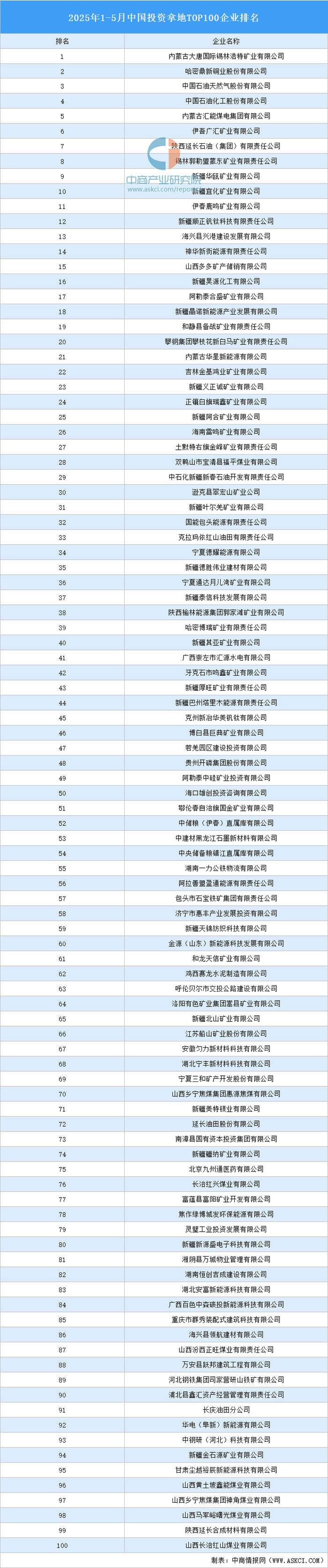 据中商产业研究院产业地产情报库监测数据显示:2025年1-5月全国投资拿地TOP100企业排行榜已揭晓。榜单显示,2025年1-5月我国投资拿地前十企业分别为:内蒙古大唐国际锡林浩特矿业有限公司、哈密鼎新铜业股份有限公司、中国石油天然气股份有限公司、中国石油化工股份有限公司、内蒙古汇能煤电集团有限公司、伊吾广汇矿业有限公司、陕西延长石油(集团)有限责任公司、锡林郭勒盟蒙东矿业有限责任公司、新疆华瓯矿业有限公司、新疆宜化矿业有限公司。