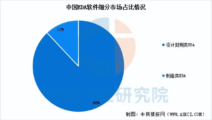 按照产业链环节划分,EDA软件可分为设计类EDA、制造类EDA和封测类EDA三大类,其中设计类与封测类工具常被合并统计,形成“设计封测类EDA”这一细分领域。中商产业研究院发布的《2025-2030年中国EDA软件行业深度挖掘及投资决策分析报告》显示,2023年设计封测类EDA市场合计占比88%,制造类EDA占比相对较小,约为12%。