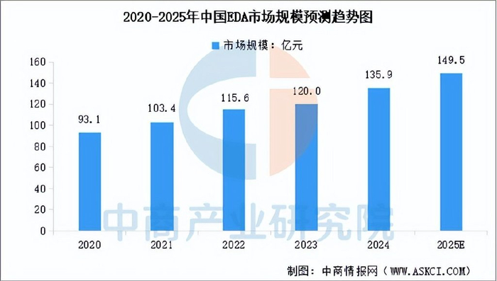 近年来,随着国内集成电路产业的快速发展以及5G、人工智能、物联网等新兴技术的普及,中国EDA市场规模呈现出快速增长的态势。中商产业研究院发布的《2025-2030年中国EDA软件行业深度挖掘及投资决策分析报告》显示,2024年中国EDA市场规模约为135.9亿元,近五年年均复合增长率达6.55%。中商产业研究院分析师预测,2025年中国EDA市场规模将达到149.5亿元。