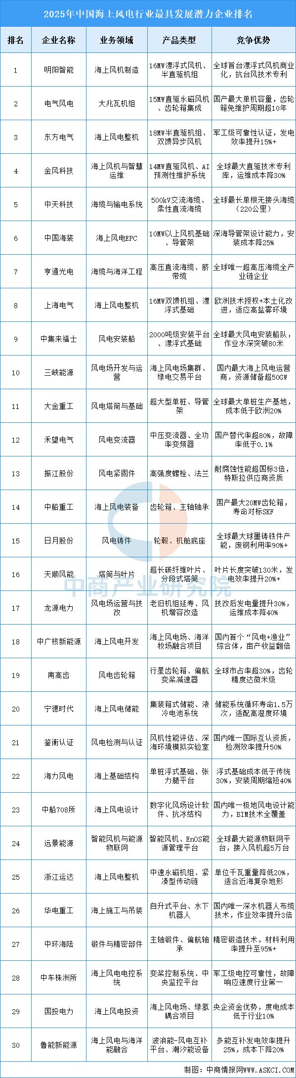 海上风电是指在潮间带、近海海域等区域建立风力发电场将风能转化为电能,随着全球能源转型加速、环保意识增强以及各国政策支持,海上风电凭借其资源丰富稳定、沿海电网接入条件好等优势而兴起,带动了众多海上风电企业投身于从开发设计、生产制造到施工建设、运维管理等产业链各环节,推动海上风电产业不断发展。