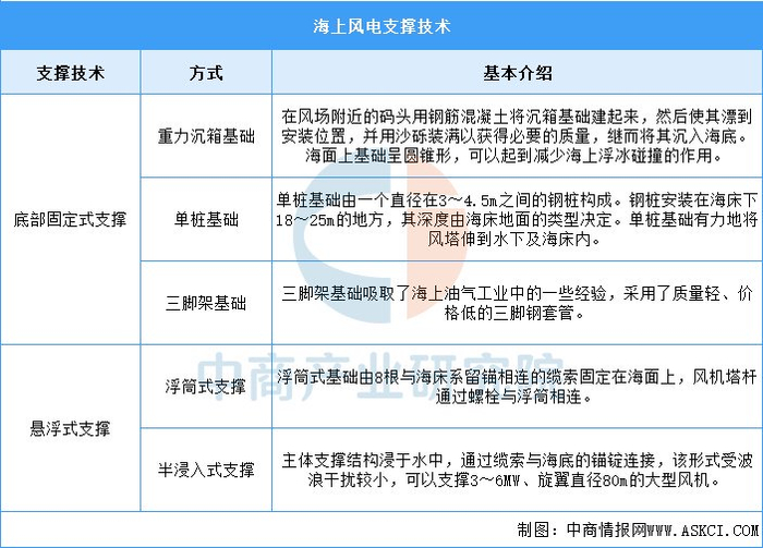 海上风电是指在潮间带、近海海域等主要区域建立风力发电场,并将风能转换为电能的一种使用离岸风力能源的方式。海上风电是重要的海洋新兴产业,具有产业链条长、技术含量高、产业规模大的特点,拥有良好的发展前景。海上风机的支撑技术主要有底部固定式支撑和悬浮式支撑2类,具体如图所示: