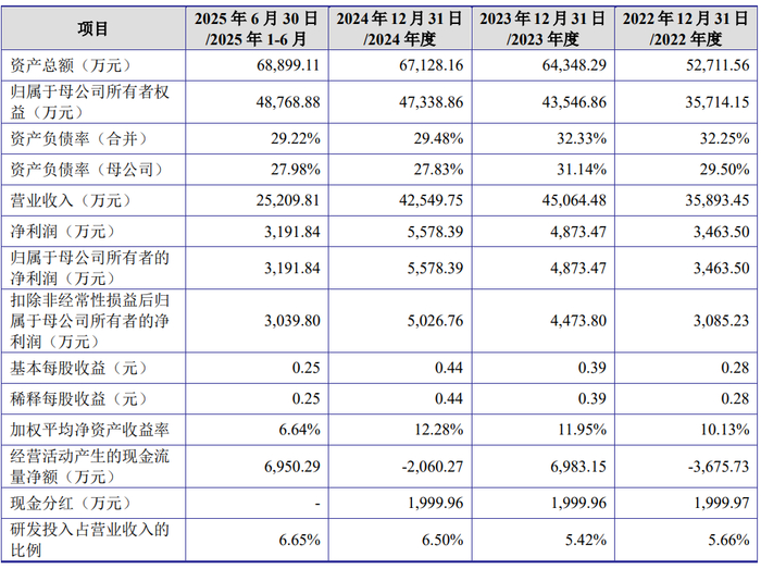 2022-2024年,公司研发费用分别为1579.57万元、1820.34万元、2259.40万元,占营业收入比例分别为6.53%、7.71%、7.11%。