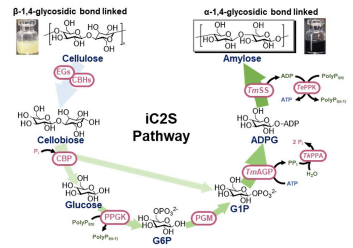 为了解决这个难题,张以恒和团队没有局限于对原有路径的优化,而是采取了“问题导向、需求导向”的研发策略,从头设计了全新的、更为精巧的体外合成酶途径——iC2S(in vitro Cellulose-to-Starch)(图1)。